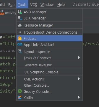 5. 안드로이드 스튜디오에서 새로운 프로젝트를 만든뒤에 Tools에 firebase를 눌러준다.