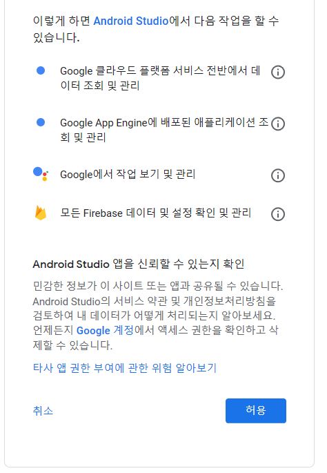 그러면 이렇게 로그인 화면이 나오게 되고 파이어베이스를 사용할 때 쓰는 구글 아이디로 로그인하면 된다.